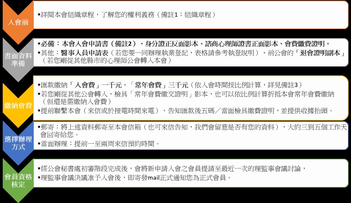 3.將「勞健投保表」、「最近年度的綜合所得清單正本」、「諮商心理師證書影本」、「執業執照正反面影本」,以上四項資料以書面寄送到公會來。